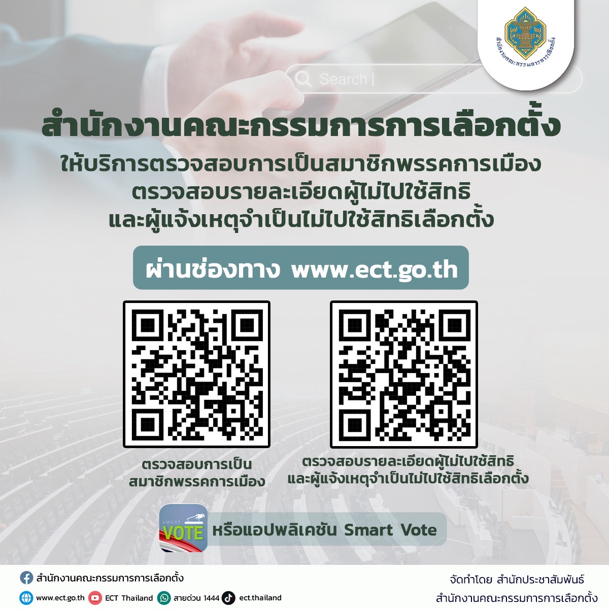 ประชาสัมพันธ์ ตรวจสอบการเป็นสมาชิกพรรคการเมืองและรายละเอียดการไม่ไปใช้ิสิทธิเลือกตั้ง การแจ้งเหตุความจำเป็น