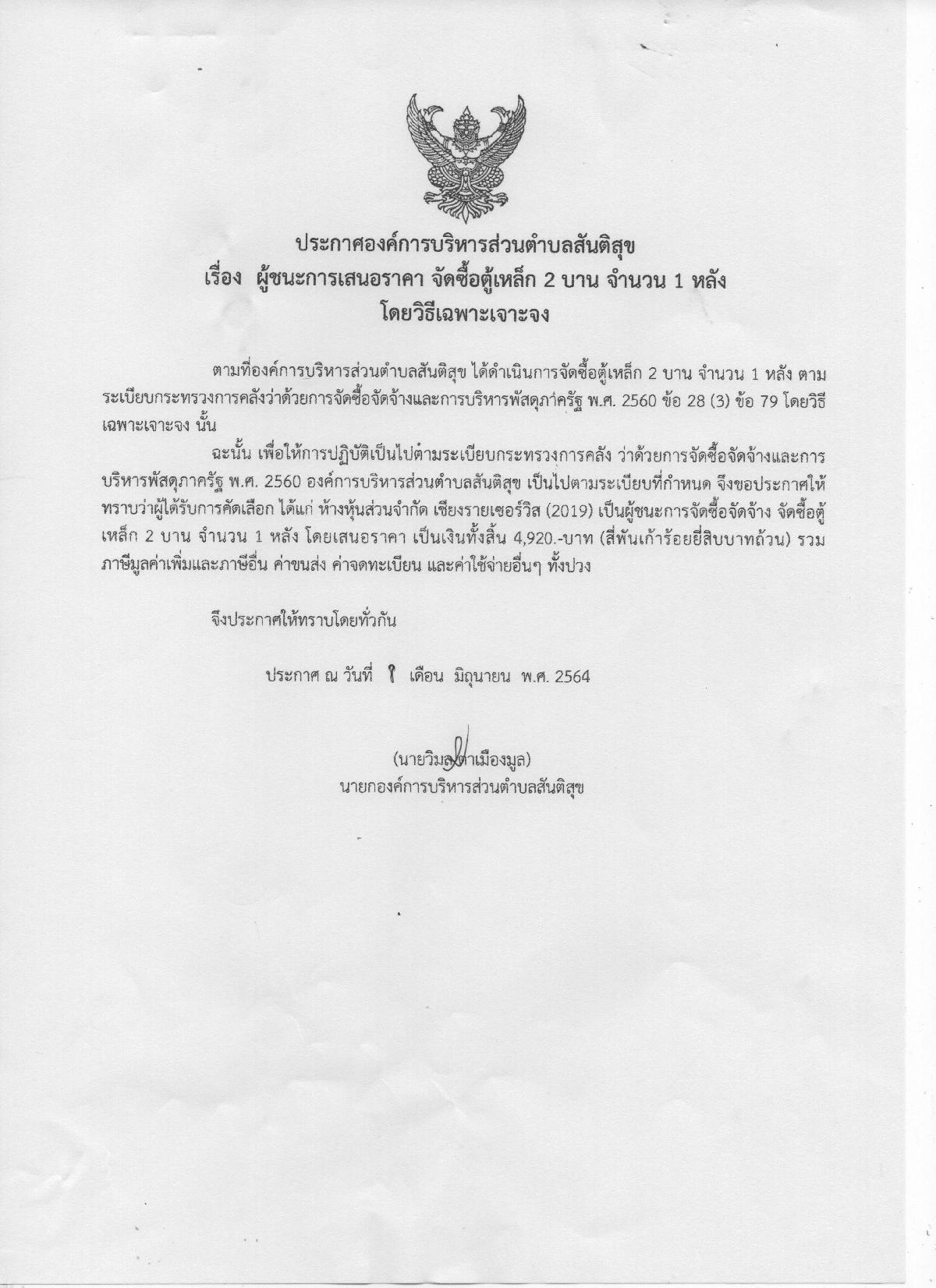 ประกาศองค์การบริหารส่วนตำบลสันติสุข เรื่อง ประกาศผู้ชนะการเสนอราคา จัดซื้อตู้เหล็ก 2 บาน จำนวน 1 หลัง