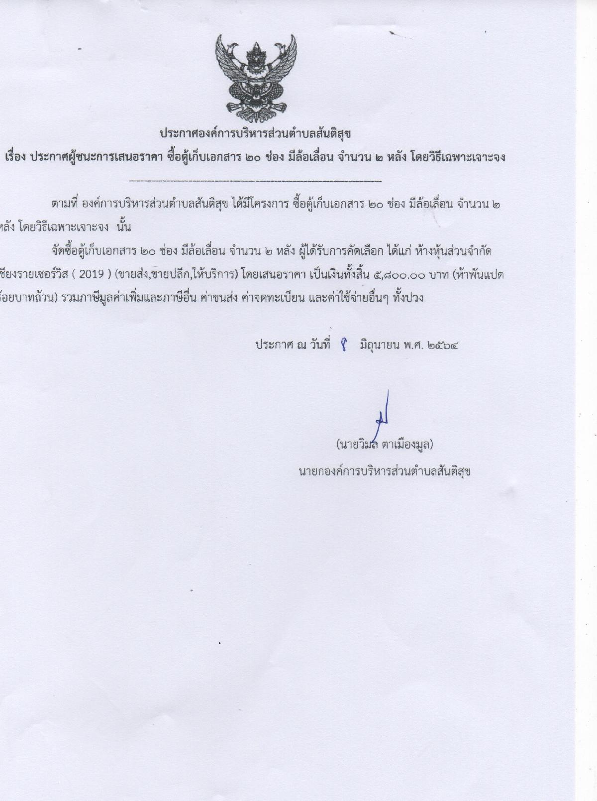 ประกาศองค์การบริหารส่วนตำบลสันติสุข เรื่อง ประกาศผู้ชนะการเสนอราคา จัดซื้อตู้เก็บเอกสาร 20 ช่อง มีล้อเลื่อน จำนวน 2 หลัง